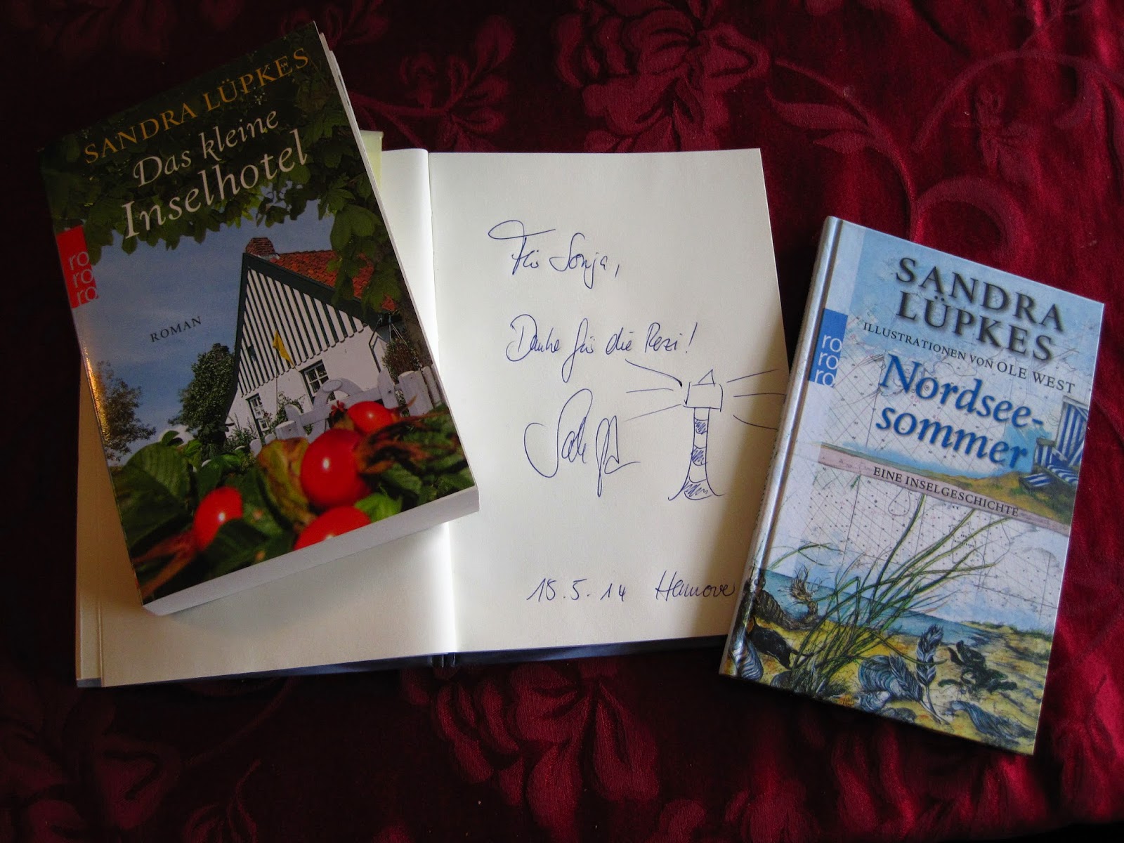 Die Autorin las die Geschichte sehr lebhaft und hatte dazu passende Lieder herausgesucht, die sie vortrug. Die Abschnitte zwischen Vorlesen und Singen wurden mit Möwenlärm übergeleitet, so dass richtiges Urlaubsfeeling aufkam. (Wer also seinen Strandurlaub vermisst, der sollte unbedingt zu diesem Buch greifen.)Hierzu muss gesagt werden, dass Sandra Lüpkes früher eine Band namens “Strandgut” hatte. Die vorgetragenen Lieder, sind Lieder, die die Band nie veröffentlicht hatte und die von der Autorin vor einiger Zeit wieder gefunden wurden. Eigentlich hätte man die Lesung in dieser Form auch gleich aufzeichnen sollen, es wäre das perfekte Hörbuch herausgekommen. (In einer Szene kam im Text eine Klospülung vor, die dann auch tatsächlich durch die Buchhandlung rauschte.)