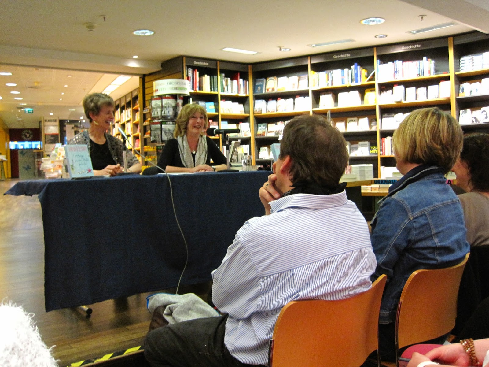 Bereits bei der Einleitung durch Frau Fischer von Hugendubel hatte Frau Phillips die Lacher auf ihrer Seite, denn was Frau Fischer nicht mitbekam, Frau Phillips stand bereits hinter einer Buchsäule und machte mit dem Smartphone Fotos vom Publikum.